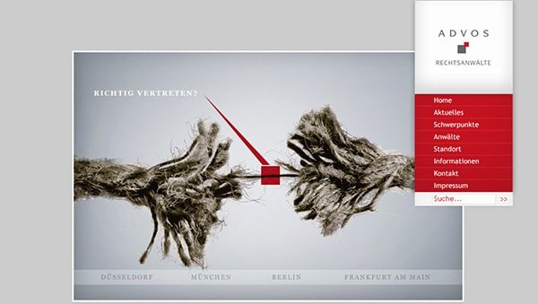 Für die Kanzlei ADVOS aus Düsseldorf wurde basierend auf einer themenbezogenen Bildsprache eine Internetpräsenz sowie weitere Medien im Print entwickelt.